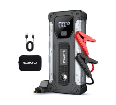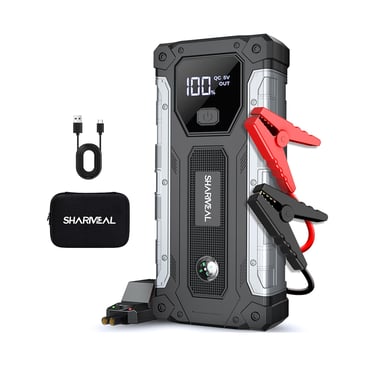 Sharmeal Car Jump Starter 5000A, Jump Starter Battery Pack for 10.0L Gas and 9.0L Diesel, 12V Portable Jump Box with LED Light. With dual USB (5V/2A) output, this car starter battery pack can be used as a power bank to charge smartphone, laptop, and other USB devices.