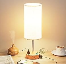 Fenmzee Bedside Table Lamp for Bedroom - 3 Way Dimmable Touch Lamp USB C Charging Ports and AC Outlet, Small Lamp Wood Base Round Flaxen Fabric Shade for Living Room, Desk, LED Bulb Included