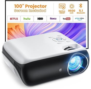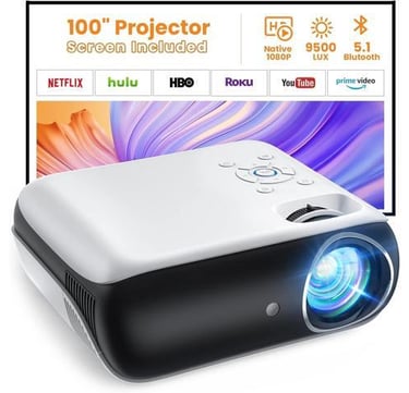 HAPPRUN Projector, Native 1080P Bluetooth Projector with 100''Screen, 9500L Portable Outdoor Movie Projector Compatible with Smartphone, HDMI,USB,AV,Fire Stick, PS5